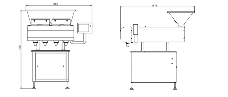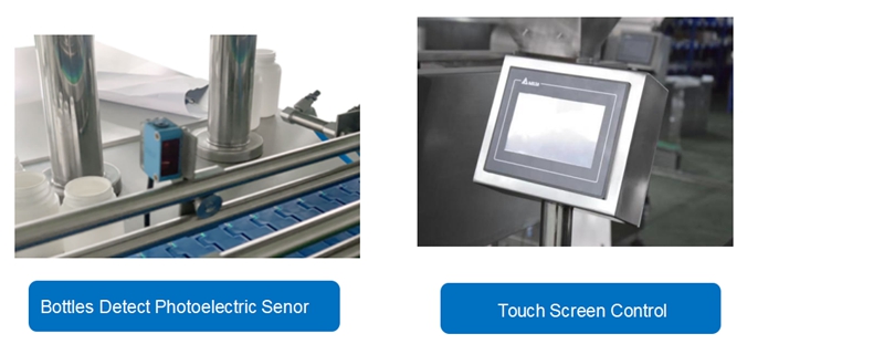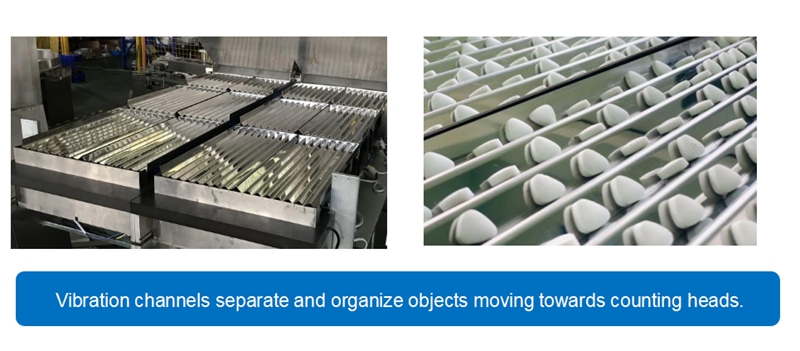 The bottle blocking device on the conveyor belt blocks the transferred bottle at the bottling position, waiting for filling. The material falls into the counting device in an orderly manner through the vibration of the feeding corrugated plate, and is counted by the photoelectric counting sensor and then loaded into the bottle at the bottling position.