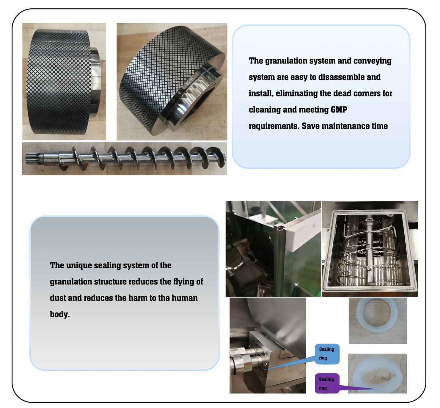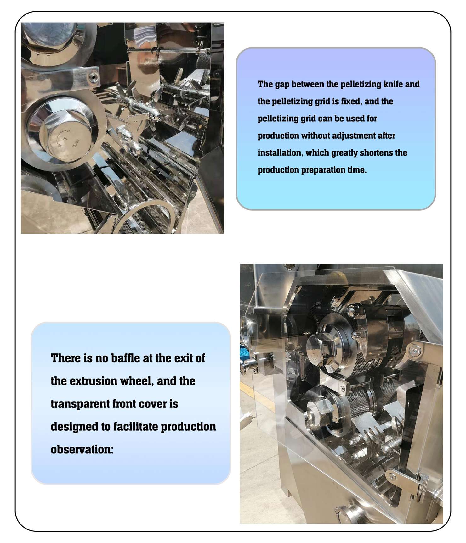 4. The gap between the pressing wheels is adjustable to ensure consistent tableting density and uniform granulation;