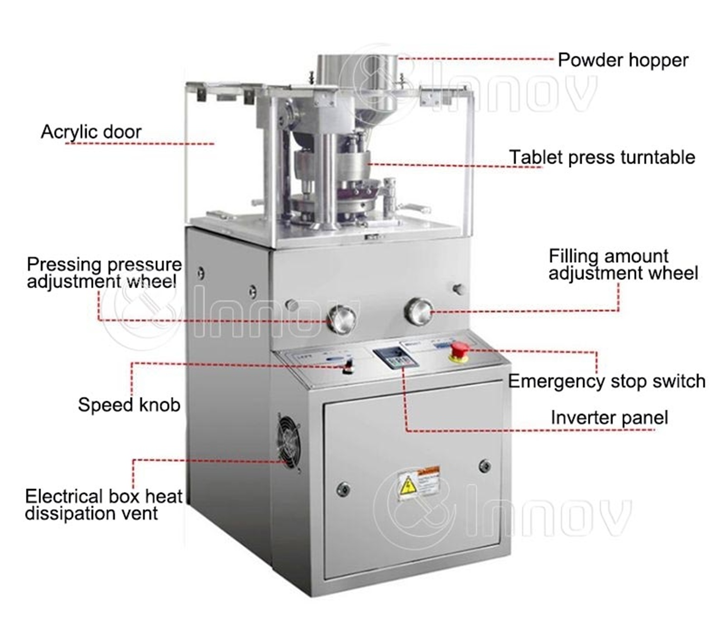 2. Equipped with a plexiglass perspective window for easy observation of the tablet press status. The side panel can be fully opened for easy cleaning and maintenance. All monitoring and operating components are reasonably designed. The frequency conversion speed regulation device is used for electrical adjustment, which is convenient to operate, stable, safe and reliable.